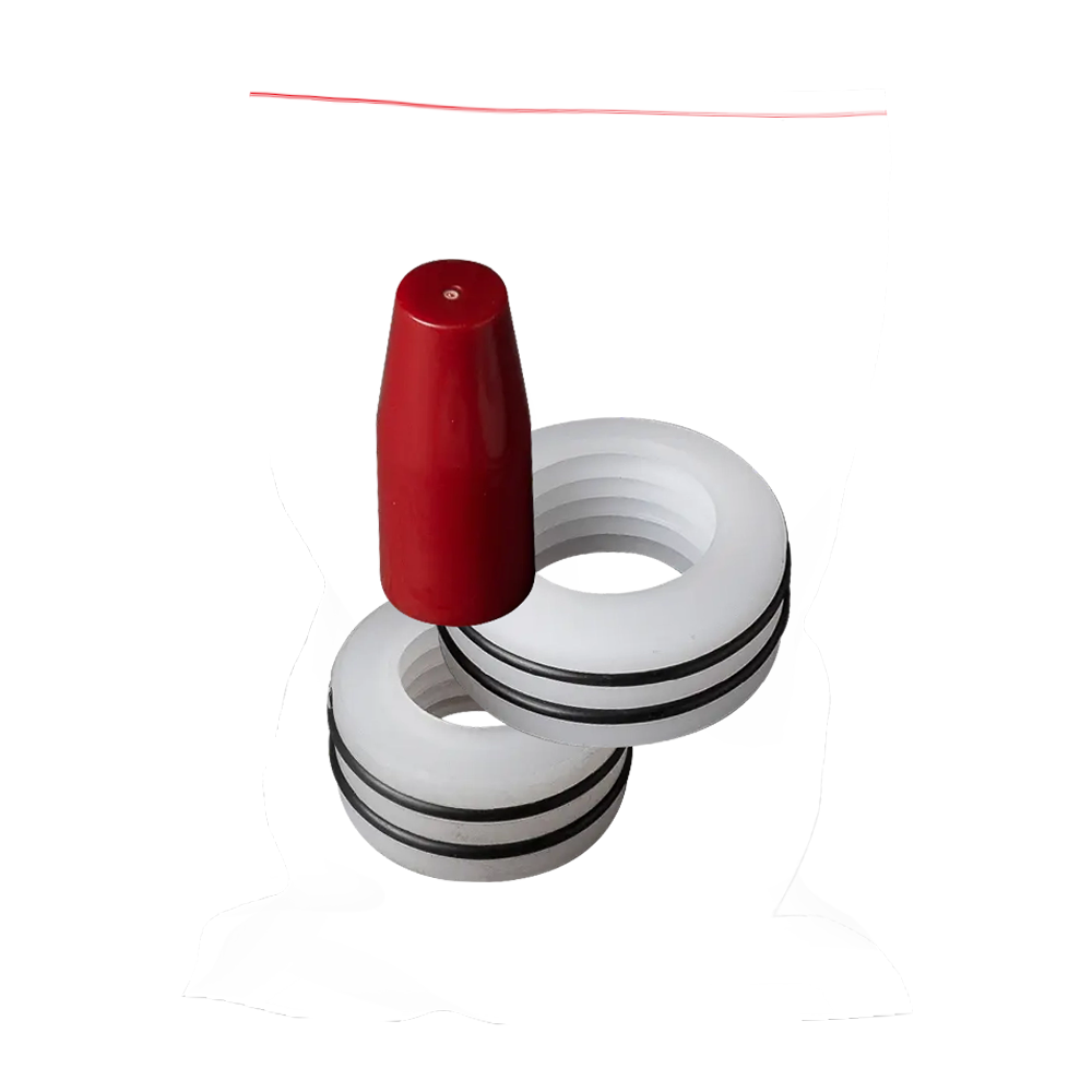 Комплект уплотнений состоит из двух разных колец (по диаметру и толщине), изготовленных из сверхвысокомолекулярного полиэтилена UHMWPE. Они предназначены для герметизации рабочего объема насоса и устанавливаются в его корпус. В процессе работы плунжер вызывает износ уплотнений. Признак их износа - появление краски в горловине насосе.